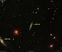 NGC 444 is a spiral galaxy of type Sd located in the constellation Pisces. It was first discovered on October 26, 1854 by R. J. Mitchell (and later listed as NGC 444), and was also spotted on October 17, 1903 by Stéphane Javelle (and later listed as IC 1658). It was described by Dreyer as "very faint, much extended 135°, a little brighter middle."[2]