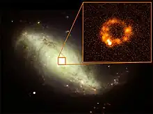 The ring is brighter north of the nucleus and there is inhabited by the younger star populations.[7] Brandl et al. detected in near- and mid-infrared nine prominent structures within the ring they identified as star clusters with stellar ages ranging between 5.5 Myr and 6.3 Myr. These clusters account for the 75% of the bolometric luminosity of the starburst ring, with total luminosity of the clusters 2.1 × 1010 L⊙.[4] Numerous supernova remnants have been observed in the ring. Further observations of the galaxy in radio waves showed that NGC 7552 contains three star forming rings of radii 1.0 kpc, 1.9 kpc, and 3.4 kpc as observed by the Very Large Array at 46.9 MHz and the Australia Telescope Compact Array.[10]