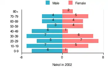 According to the 2002 Poland census, there were 77 people residing in Nakol village, of whom 54.5% were male and 45.5% were female. In the village, the population was spread out, with 24.7% under the age of 18, 39% from 18 to 44, 16.9% from 45 to 64, and 19.4% who were 65 years of age or older.[2]