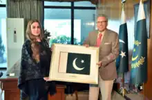 ![]() Namira Salim presents President Arif Alvi, President of Pakistan the National Flag she flew to space | |