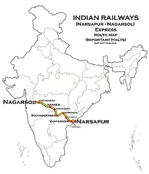 The 12787/ 88 Narasapuram Nagarsol superfast Express runs from Narasapuram via Bhimavaram Town, Vijayawada Junction, Warangal, Kazipet Junction, Secunderabad Junction, Nizamabad Junction, Hazur Sahib Nanded, Parbhani Junction, Aurangabad to Nagarsol.