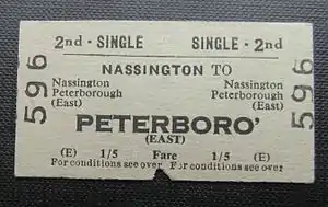 Nassington station closed to passengers on 1 July 1957, (at the same time as Wansford railway station and Castor railway station, the next two stations east towards Peterborough), and to goods on 3 August 1957.[4] The line remained open until the withdrawal of the passenger service from Rugby (Midland) to Peterborough (East) on 6 June 1966. On that date the section from Rugby (Midland) to King's Cliffe was closed completely, but the line east of King's Cliffe station remained open for goods traffic.[5] On 3 June 1968 King's Cliffe station was closed to goods along with the track as far as the junction with a private siding into the ironstone quarries owned by Naylor Benzon 1 kilometre (0.62 mi) west of Nassington station.[6] The last train to the quarry ran on 4 January 1971, and the siding and railway at Nassington finally closed on 26 February 1971.[7]