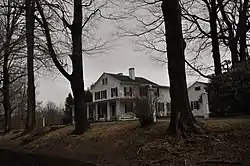 The Nathan B. Booth House stands in what is now a residential area of the Putney section of Stratford, on the east side of Main Street a short way north of the Boothe Memorial Park and Museum. It is set on a rise above the street, with its front facade facing west. It is a 2+1⁄2-story timber-frame structure, with a gabled roof and clapboarded exterior. A single-story porch of early 20th-century construction extends across the front facade and around part of the north and south sides. The main facade is three asymmetrically placed bays wide, with the main entrance set in the rightmost bay, flanked by sidelight windows and topped by a transom. The ground floor windows are full length in the Greek Revival style. The interior follows a fairly typical Greek Revival side hall plan, with a curved staircase rising in the main hall, and many other original period features.[2] It illustrates a vernacular transition between Greek Revival architecture and Federal architecture styles.[2]