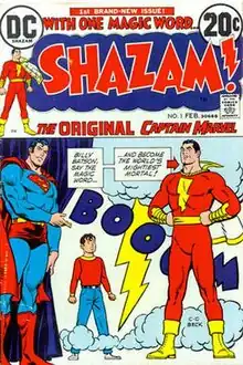 In 1987, DC Comics relaunched Captain Marvel in a miniseries, Shazam!: The New Beginning, and purchased the full rights to all of the Fawcett superhero characters by 1991.[1] Captain Marvel has not proven to be a modern-day success for DC to the degree it had been for Fawcett, due in part to DC not being able to properly promote the character under the "Captain Marvel" name, which is a Marvel Comics trademark. As a result, when DC Comics rebooted its entire comic line under the New 52 initiative in 2011, Captain Marvel was renamed "Shazam" and was reintroduced to comics the following year under that name.[8]
