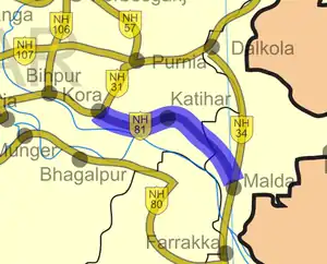 National Highway 81 (NH 81) is a National Highway in Eastern Indian states of Bihar and West Bengal. NH 81 links Kora in Bihar to Malda in West Bengal. Of its 100 km (62 mi) length, NH 81 runs for 45 km (28 mi) in Bihar and 55 km (34 mi) in West Bengal. [1] [2]