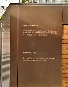 1. 1 2 3 "Holocaust Namenmonument Nederland". holocaustnamenmonument.nl. Dutch Auschwitz Committee / Nederlands Auschwitz Comité. 2021. Retrieved 25 April 2023. King unveiled National Holocaust Names Memorial On Sunday 19 September 2021, His Majesty the King, together with Jacques Grishaver, chairman of the Dutch Auschwitz Committee, unveiled the new Holocaust Names Memorial in Amsterdam.