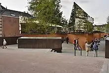 The memorial was designed by Studio Libeskind of the American architect Daniel Libeskind and built by Rijnboutt architects Amsterdam with bricks donated by Rodruza brick company, Rossum, Gelderland.[1] The 1,550 square meter monument consists of four sections representing the letters in the Hebrew word לזכר (from right to left Lamedh, Zayin, Kaph and Resh, lizkor, pronunciation "lizachàr") meaning "In Memoriam".[4]