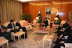 The National Security Council was re-created by then-President and former General Pervez Musharraf in April 2004 under the National Security Council Act. Although, the NSC remains to as a statutory body, the National Security Council is not active since 2008, and the Defence Committee of the Cabinet is fulfilling the role and purpose of the NSC.[3] The first National Security Adviser was Tariq Aziz who was appointed in 2004 and was preceded by Major-General (retired) Mahmud Durrani in 2008.[3] Since Durrani's deposing by Prime Minister Yousaf Raza Gillani in 2009, there has been no appointed new NSC adviser since then.[3] The NSC was abandoned by the government of Pakistan Peoples Party (PPP), with a unified confirmations from the Parliament, and its functions has been taken under control by the Defence Cabinet Committee as of 2009.[1]