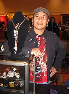 Metal jewelry came to the Plains through Spanish and Mexican metalsmiths and trade with tribes from other regions. Southern Plains Native Americans adopted metalsmithing in the 1820s. They typically cut, stamped, and cold hammered German silver, a nickel alloy.[14] Plains men adopted metal pectorals and armbands.[15] In the late 19th and early 20th centuries, members of the Native American Church revealed their membership to others through pins with emblems of peyote buttons, water bird, and other religious symbols.[16] Bruce Caesar (Sac and Fox-Pawnee) is one of the most prolific Southern Plains metalsmiths active today and was awarded the NEA's National Heritage Fellowship in 1998.[17] US Senator Ben Nighthorse Campbell (Northern Cheyenne) is an accomplished silversmith.[18]