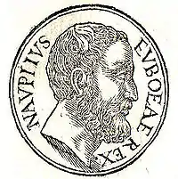 Nauplius, also called "Nauplius the Wrecker",[14] was a king of Euboea, and the father of Palamedes. According to Apollodorus, the son of Poseidon and Amymone, and the father of Palamedes are one person who "lived to a great age".[15] Apollodorus reports that in the Nostoi (Returns), an early epic from the Trojan cycle of poems about the Trojan War, Nauplius' wife was Philyra, and that according to Cercops his wife was Hesione, but that according to the "tragic poets" his wife was Clymene. In addition to Palamedes, Nauplius had two other sons, Oeax and Nausimedon.[16]