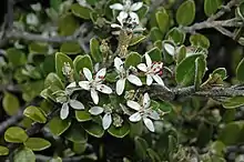 Nematolepis ovatifolia is a small, dense shrub with more or less angled to terete stems covered in light rust coloured scales and sparsely dotted with warty glands. The leaves are wide egg-shaped to broadly elliptic, 0.9–1.2 cm (0.35–0.47 in) long, 5–10 mm (0.20–0.39 in) wide, margins mostly flat, upper surface dotted with glands, underside silvery scales. The inflorescences are a small, tight cluster of 1-3 white flowers, petals about 4 mm (0.16 in) long, pink in bud, dotted with glands, individual flowers and cluster stems thick, flattened and together 2–4 mm (0.079–0.157 in) long. The bracts oblong to egg-shaped, 1–1.5 mm (0.039–0.059 in) long, sepals almost upright, triangular shape and 2 mm (0.079 in) long. The dry, erect' seed capsule is more or less square, about 3 mm (0.12 in) long with a short rounded point. Flowering occurs in summer.[2][3]
