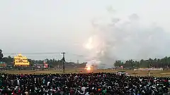 Nemmara and Vallanghy are two neighbouring villages in the south part of Palakkad district, which is in the valley of Nelliyampathi hills. The green carpet of paddy field will turn to the festival ground in the first week of April. The festival falls on 20th of 'Meenam' according to the Malayalam Calendar (2nd or 3rd of every April).[1] The 'Kodiyettam' (starting) will be celebrated on 'meenam 1st' every year. The celebration continues for the first 20 days of 'meenam', and on 20th day the Vela festival will be celebrated. The annual Vela festival, celebrated by Nemmara and Vallangi villages after the paddy harvest, is famous for its display of fireworks and caparisoned elephants.[2]