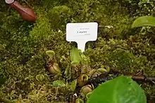 The urceolate pitchers are generally quite small, rarely exceeding 10 cm in height and 7 cm in width. The peristome is greatly incurved, with the inner section accounting for around 85% of its total cross-sectional surface length.[14] Upper pitchers are very rarely produced and are considerably smaller than those formed on rosettes or offshoots. Pitchers range in colouration from light green throughout to completely dark red, with many intermediate forms recorded. The pitchers of N. ampullaria from Sumatra and Peninsular Malaysia are almost exclusively green throughout or green with red speckles; the red forms are mostly confined to Borneo. A large-pitchered form has been recorded from New Guinea.[13][15]