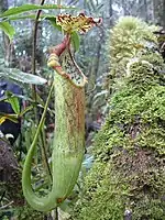 Nepenthes naga is a tropical pitcher plant endemic to the Barisan Mountains of Sumatra. It is characterised by a forked sub-apical appendage on the underside of the lid and an undulate lid margin.[2] The specific epithet naga is the Indonesian word for "dragon" and refers to the distinctive lid appendage of this species as well as the large size of its pitchers. The name also references local folklore, which tells of dragons occurring in this species's habitat in the past.[2]