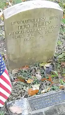 After the war, Hawley became a brickmaker. On March 14, 1791, Hawley, described in the old North Stratford Ecclesiastical Society book as a "free Negro man", withdrew with others from the Congregational Society of North Stratford and became a member of the Episcopal Church at Ripton, now Huntington.[6] On May 26, 1808, Hawley's pension was increased to $3.33 per month. He received a final pension increase to $40 per year in 1813.[7] Nero Hawley died in 1817 at the age of 75, and is buried in the Riverside Cemetery in Trumbull Center.