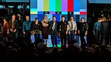 The plot closely follows that of the 1976 film but uses stage devices and audio visual technology to immerse the audience as participants.[9] The audience becomes part of the play both as diners and a studio audience. The distance between fact and fiction is reduced, mimicking the blurring of truth and fiction in contemporary news media.[10]