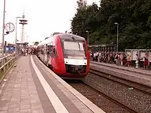 The Neumünster–Bad Oldesloe railway is an approximately 45-kilometer-long single-track, non-electrified main line in the German state of Schleswig-Holstein. It connects the central Holstein town of Neumünster with Bad Oldesloe, the seat of the district of Stormarn. Since December 2002, passenger services on the line have been operated by Nordbahn Eisenbahngesellschaft.