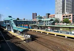 A station closer to New Haven's business district than Union Station was first proposed in 1996.[5] The station opened on June 7, 2002, for Shore Line East service, with Metro-North service added on June 24, 2002.[1][5] Hartford Line and New Haven–Springfield Shuttle service began on June 16, 2018.[6] Most Shore Line East and all Hartford Line trains (both Amtrak and CTrail) stop at the station.[7] Travel time to Union Station is approximately two minutes and is fare-free, except on Metro-North. Metro-North trains only serve the station on weekday reverse peak runs (plus one midday trip). There are five trains from Grand Central Terminal and six trains to Grand Central per weekday.