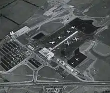 In 1929, Newcastle-upon-Tyne City Council set up a special committee to investigate the potential for building an airport to serve the North-East of England, considering 18 locations before selecting a site at Woolsington, about 5 mi (8.0 km) northwest of the city centre.[6] The airport was opened on 26 July 1935 as Woolsington Aerodrome by the Secretary of State for Air, Sir Phillip Cunliffe-Lister. Incorporating a clubhouse, hangar, workshops, fuel garage and grass runway, it cost £35,000 to build.[7] The airport became the base for the Newcastle upon Tyne Flying Club, which moved from its previous home at Cramlington Aerodrome and ran the new airport on behalf of the council.[8] On 1 June 1939, No. 43 Elementary and Reserve Flying Training School, operated by Newcastle Flying Club and equipped with a mixture of de Havilland Tiger Moths, Miles Magisters and Hawker Hinds opened at Woolsington, as one of a large number of civil-operated flying schools set up to train aircrew for the RAF. The school was disbanded on 3 September 1939, with the outbreak of the Second World War.[9][10]