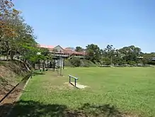 Changes to the school grounds have also occurred since WWII. These included the construction of stairs to the oval (the current concrete stairs date from the 1960s, replacing an earlier set).[95][96] Additions made to the Newmarket School Reserve when it increased to 8 acres (3.2 ha) 13.1 perches (330 m2) in 1963-4 included the extension of the playing field to its west, as part of works relating to the opening of the Newmarket State High school. Much of the bank excavated during the 1930s along the southern edge of the oval was removed or altered at this time.[97][98] New tennis courts and a shelter shed were completed between 2002 and 2004.[99][93] More recent buildings added to the school grounds are located along the Banks Street boundary and around former netball courts in the southeast corner. In the area in front of Block A's entrance portico garden beds have been created, early paths have been paved or laid with bitumen, and several memorials have been established.[94][1]