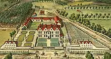 Nibley Hall (formerly 'Nibley House') was inherited by his son, also John (1611-1692). The younger John was also a writer, his most notable work being “A Description of the Hundred of Berkeley”; from about 1640 he was reluctantly caught up in the Civil War.[5] The younger John’s eldest son, Edward, married Rose, daughter of Sir Edward Leech (MP) or Leche of Shipley Hall; John, considering them extravagant, left his estate in North Nibley to his grandson George Smyth, it being settled on him at the time of his marriage in 1691.[6][7] In the early 1700s George had a coloured engraving made of his estate.[8] His son, also George, was born shortly after his father died in 1712. In his will the senior George Smyth left all of his estates to his then-unborn child, whether son or daughter.[9] The younger George Smyth made major alterations and additions to the Jacobean house from 1763 and transformed it into the present house.[10] In 1735 he married Sarah, the daughter of Henry Biggs of Benthall.[11] In 1767, their son Nicholas married Anna Maria, daughter of Sir Charles Leighton, and heiress to her grandmother’s Condover estates. Their only son, also Nicholas, inherited Nibley House on the death of his father.