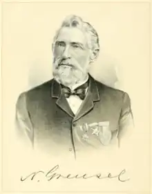 Soon after, Greusel was elected major and then lieutenant colonel of the city guards. In 1849 he was appointed superintendent of the city water works and in 1850–1852 he became Inspector General of lumber for Michigan. At this time, Greusel made a bad investment, which cost him his life savings. He spent the following years working as a conductor for the Michigan Central Railroad.[1] He later moved to Aurora, Illinois, and took a job with the Chicago, Burlington and Quincy Railroad.[2] On April 18, 1861, after the Battle of Fort Sumter, Captain Greusel enrolled the Aurora Company in the Illinois militia for three-months service.[3] The company was absorbed into the 7th Illinois Infantry Regiment on April 25.[4] Greusel rose in rank to become lieutenant colonel of the 7th Illinois. On August 14, Governor Richard Yates appointed Greusel colonel of the "Fox River Regiment". This unit became the 36th Illinois Infantry.[5]