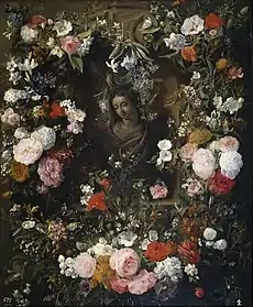 An example of a work by van Verendael in this genre is the Garland surrounding the Virgin Mary (Prado, Madrid) a collaboration with an unknown collaborator. The central motif is a sculpture rather than a painting of the Madonna as was more common. The garland of flowers is represented in groups, rather than in a circle, and is thus representative of the later evolution of this genre. The subject of the exaltation of the figure of Mary was a response to Protestant beliefs and is reinforced by the inscription 'ego flos campi' ('I am the flower of the field') at the foot of the bust.[10]