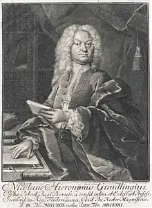 Nicolaus Hieronymus Gundling (February 25, 1671 December 9, 1729), was a German jurist and eclectic philosopher. He was born in Kirchensittenbach, and died in Magdeburg. He was the brother of Jacob Paul von Gundling, Court Historiographer to King Frederick I of Prussia, who became a figure of ridicule in the "Tobacco Cabinet" (Tabakskollegium) of Frederick William I.