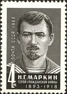 Nikolai Markin (Russian: Николай Григорьевич Маркин, born 21 May 1893 in Gorodishchensky District – 1 October 1918 in the village of Pyany Bor on the River Kama)[1][2] was a Bolshevik revolutionary and sailor. When he was young his parents had been textile workers in one of the factories in Penza province but they subsequently moved to Vladikavkaz. He was a member of the central Executive Committee of the First Congress of Soviets in 1917.