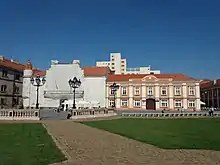 In 1761, the two-storey neoclassical building designed by the architect Heinrich Baader and built by the civil engineer Johann Reiber[6] was initially the Serbian (Rascian) Town Hall, then a forerunner of the German State Theater in Timișoara with German classics on the repertoire.[7] The "waltz king" Johann Strauss II often made guest appearances here,[6] and in 1796 the first performance of Wolfgang Amadeus Mozart's The Magic Flute took place there.