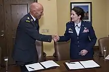 When the Space Force was established in 2019, Armagno was tapped by then-Lieutenant General David D. Thompson to help stand-up the new service, working as the S2/3/4/6/8/9/10 while still officially assigned as the director of space programs.[11] She was nominated on July 28, 2020, for transfer to the United States Space Force and promotion to lieutenant general. She was also assigned to serve as its first director of staff.[12] She transferred and was promoted on August 17, 2020, becoming the first female general officer in the Space Force.[13]