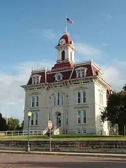 County court buildings in the nineteenth century United States were designed to house judicial and administrative functions in styles such as Federal, Neoclassical, Italianate, Second Empire, and Romanesque Revival, which were adapted to local building materials and styles to accommodate local needs.[1] Over the course of the nineteenth century, the typical American county courthouse became more specialized than its eighteenth century predecessor, featuring increased usage of interior passageways and multiple levels and stairwells to facilitate a greater level of formality to court proceedings than could often be achieved through earlier examples which were centered around a single room on the ground floor. The gradual replacement of courtroom fittings associated with the English common law with those associated with American adversarial statute law, along with the use of clock towers, statuary, turrets, domes, and other architectural features became increasingly central to the iconography of local American public life, which represented at once the ideal of equal and impartial justice before the law in criminal and civil disputes, as well as the more wealth based and paternalistic ideal of justice represented by such cases as probations of estates, recording of deeds and property boundaries, assessments of taxes, enforcements of debts, evictions, and transfers of slaves.[2]