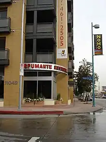 The NoHo Arts District is a community in North Hollywood, Los Angeles, California, that is home to contemporary theaters, art galleries, cafes, and shops. The community is generally bounded by Hatteras Street to the north, Cahuenga Blvd to the east, Tujunga Ave to the west, and Camarillo Street to the south. The area features more than twenty professional theaters, producing new work and classics, diverse art galleries, public art, and professional dance studios. The district also features the largest concentration of music recording venues west of the Mississippi. A Metro Rail station is located here, the North Hollywood station of the B Line and serves as the terminus of the Metro G Line busway.