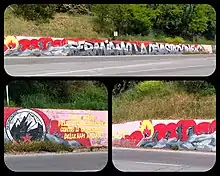 Among the campaign slogans that have arisen from demonstrations, besides No Cav, there is "Basta Cave"[49] (lit. Enough Quarries: Stop the Quarries), "Giù le mani dalla montagna"[50] (Hands off the Mountain), "Fermiamo la devastazione"[51] (Let's stop the Devastation), "Help Apuan Alps",[52] "Le cave uccidono il passato e il futuro"[4] (The quarries are killing the past and the future), "Excavation devastation",[20] and more.