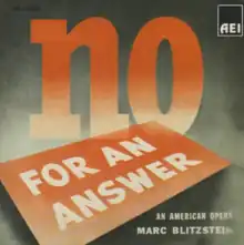 No For An Answer is a musical play by Marc Blitzstein.[1] It was staged by W. E. Watts at Mecca Temple, west 55th Street, New York, on Sunday, January 5, 1941.[2] Although it was supposed to have a limited engagement, it ran for two additional Sundays. There was no scenery and Marc Blitzstein was at the piano. It was an experiment under an agreement between the Dramatists Guild and Actors Equity. The cast included Olive Deering, Lloyd Gough, Martin Wolfson, Norma Green, and Curt Conway.[1] It marked the New York debut of Broadway icon, Carol Channing.[3][4] It was much discussed prior to its opening and Random House accepted it for publication just before its production.[5] Brooks Atkinson stated in his review of the work in The New York Times, "it is very exciting in performance, which is all that matters."[6] Although Aaron Copland called it one of "the most original works in that form composed in this county,"[7] the play was a failure.[8]