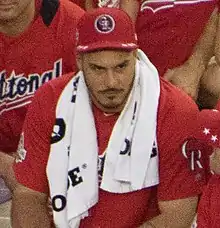 In 2015, Arenado earned his second NL Player of the Week Award on June 28, hitting a major league-leading three multi-home runs games in six games, seven home runs and 14 RBI. He also scored 10 times, second-highest in the major leagues.[34] He became an MLB All-Star for the first time as a National League reserve at Great American Ball Park in Cincinnati. At the time his selection was announced, he was fifth in the majors in home runs with 24 and led in RBI with 68. He had hit more home runs in road games than at Coors Field (15 to nine), more RBI (37 to 31) and posted higher on-base (.318 to .309) and slugging (.615 to .580) percentages.[35][36] Playing against the San Francisco Giants on September 5, Arenado homered in his sixth consecutive game, breaking the Rockies' team record of five which Dante Bichette and Larry Walker shared.[37] He won his first NL Player of the Month award in September, batting .339 and leading the major leagues with 11 home runs, 32 RBI, and 79 total bases. He collected an NL-leading 38 hits and was second in the league with .705 SLG.[38]