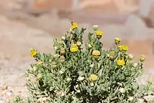 Flowers are present between August and November.[2] They may, however, be present year-round and are also common between March and May.[4] The yellow disc shaped flower heads are solitarily arranged on the ends of branches. The disc (outer) florets are sometimes purplish in the upper part.[3] The pappus (a modofied calyx) is made of barbed bristles.[2] The hairy stems holding the flowers are surrounded by three to four rows of green bracts. They are sometimes tinged purple and often have yellow or orange air sacs along the midline.[3]