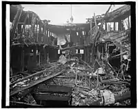 1918 was a catastrophic year for the company. On the morning of September 3, 1918, C.B. Abbott, watchman and night clerk for the Norfolk & Washington Steamboat Company was sitting in the office. Around 3:30 am, he smelled smoke and went to the back of the building to investigate. He discovered smoke in the linen room and ran out the building. There flames were shooting up the side of the building. He pulled the alarm and yelled at the watchman on the boat that there was a fire. Within a few minutes, the fire had spread to three or four rooms. Five minutes later, the Newport News as on fire from flames of the warehouse. Explosions were heard on the steamer due to cans of paint in the hold bursting. A consignment of several hundred two-quart and one-gallon tins were on the ship. The fire department was unable to save the boat. A second alarm was turned on within ten minutes as the fire was spreading quickly. By 4 am, four alarms had sounded.[24]