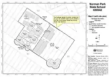 Norman Park State School occupies a 1.05-hectare (2.6-acre) site in the Brisbane suburb of Norman Park, approximately 4 kilometres (2.5 mi) east of the CBD. Located within a suburban residential area, the school is bounded by Agnew Street to the southwest, School Street to the southeast, Hipwood Street to the northeast and residential properties to the northwest. At the core of the school is the original complex of four brick classroom blocks and one timber classroom block, constructed between 1900 and 1934. The core occupies a high point in the terrain with extensive views to the west and south. The school grounds step down via a series of retaining walls towards the bounding streets, and a playing field occupies the southeast end of the site (the lower playground). The main entrance to the grounds is via a formal pedestrian stairway on Agnew Street, with secondary entrances around the school perimeter and vehicular access provided from Hipwood Street. The school grounds are well established and contain a number of significant mature trees and landscaping features such as Depression-era retaining walls, a playing field and a school bell.[1]