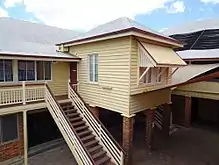 To accommodate a class for infants, an open-air annexe (Block D in 2017) was added to the school in 1915, connected to the northeast verandah of Block A. Open-air annexes were introduced as a standard design in 1914 in response to contemporary medical theories related to the need for high levels of natural ventilation and light for health.[48] The open-air annexe type was developed in metropolitan areas and built as an addition to existing school complexes to relieve overcrowded classrooms. It comprised a timber building with one solid wall (the western verandah wall) and three open sides enclosed only by adjustable canvas blinds. Ideally, they were highset, to increase ventilation and provide shelter underneath. By the 1920s open-air annexes had proved to be inadequate as the open sides provided limited weather protection and climate control, and the canvas blinds deteriorated quickly. As a final refinement of the design, canvas blinds were replaced by sliding sash windows in new and existing open-air schools and annexes throughout Queensland. Use of the open-air annexe type was discontinued from 1923.[49][1]