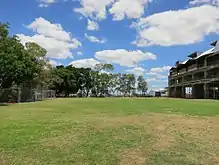In the 1920s there was concern about a lack of level parade ground space behind the urban brick school building.[56] In 1929, 32 perches (810 m2) of additional land was acquired at the northwest corner of the school reserve, allowing the toilets to be relocated there.[57][58] A basketball court had been built at the corner of Hipwood and School streets by June 1923. By 1925 there was an average of nearly 600 children attending the school, as the extension of tram lines through Norman Park had "caused a large number of people to build in the vicinity of the school".[59][60][61][1]