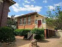 Two new brick blocks (Blocks B and E in 2017), sympathetic in design to the 1900 urban brick school building, were also added to the school and opened on 28 July 1934.[78] Block B was connected to the southeast end of Block A and featured decorative details to match Block C. It contained two classrooms on the first floor and one double classroom on the ground floor. The first floor had verandahs on the northwest and southeast sides, and a stairwell at the northeast corner led down to a ground floor verandah on the southeast side. Block E, which was highset with understorey play space, was connected to the northwest corner of Block A. It had three classrooms separated by folding partitions, and a southeast-facing verandah with a semi-enclosed hat room at the north end. Both blocks had hipped roofs of corrugated iron; Block B had a roof fleche and Block E had a dormer window over its central classroom.[79][80][81][1]