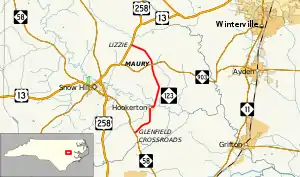 NC 123 is a two-lane rural highway that begins at NC 58 in Glenfield Crossroads, and ends at US 13 and US 258 in Lizzie. 2.4 miles (3.9 km) from NC 58, it enters the town of Hookerton where it goes north along William Hooker Drive then east on Main Street. Crossing the Contentnea Creek, it continues north to Maury, where it connects with NC 903. After 10.2 miles (16.4 km) through mostly farmland country, it reaches Lizzie where it ends.[1]