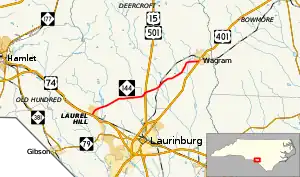 A two-lane rural highway, it traverses 12 miles (19 km) from Laurel Hill to Wagram. NC 144 provides an alternate route for U.S. Route 74 (US 74) traffic to reach US 401 while avoiding Laurinburg.[1]