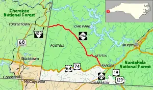 NC 294 is a two-lane mountain rural highway that is wholly in the Nantahala National Forest. From its western terminus at the Tennessee state line, it connects the communities of Liberty, Suit and Letitia to its eastern terminus at U.S. Route 64 (US 64) and US 74. It also goes by Fields of the Wood, a bible park, and access to the Hiwassee Dam.