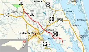 The northern section, between Camden and South Mills, is frequently used in the summer months as an alternative route to and from the Outer Banks, from travelers from the Hampton Roads metro area of Virginia.