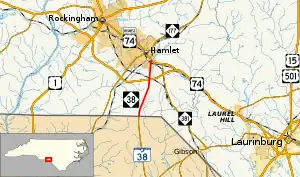 North Carolina Highway 38 (NC 38) is a primary state highway in the U.S. state of North Carolina. It runs from South Carolina state line to the town of Hamlet.
