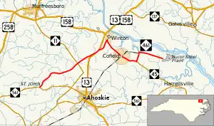 NC 461 was established in 1964 as a new primary routing from NC 561 in Saint John to US 13 south of Winton.[2] In 1999, NC 461 was extended east, with a short concurrency with US 13 it splits near Winton, where it follows along Old Highway 13 to NC 45, then in concurrency until Farmers Chemical Road, where it continues as a new primary spur to the steel plant.[3]
