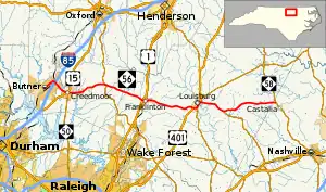 NC 56 is a predominantly two-lane rural highway connecting the three Counties of Granville, Franklin and Nash. Acting as a spur route, it begins at the intersection of Central Avenue/C Street, in Butner, and goes northeast to connect with I-85 (exit 191). Going southeasterly, it enters Creedmoor and has two brief concurrencies with US 15 and NC 50. Going in an easterly direction, it crosses NC 96, in Wilton, halfway before reaching Franklinton, where it connects with both US 1 and US 1A. Continuing east for 8.5 miles (13.7 km), it reaches Louisburg, where it has another short concurrency with US 401 and NC 39 along Bickett Boulevard. At the intersection of East Nash Street, NC 56 begin its concurrency with NC 581 to Mapleville. Continuing east for another 9.3 miles (15.0 km), it reaches its eastern terminus at NC 58, just over the Franklin/Nash County line and north of Castalia.[1]