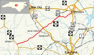 NC 902 begins at NC 22/NC 42 south of Bennett. NC 902 heads east from there and crosses Falls Creek. From there NC 902 turns northeast and goes through Harpers Crossroads at the intersection of Siler City Glendon Road. The road intersects Edwards Hill Church Road (Secondary Road 1141 or SR 1141) on its way to Bear Creek. The road crosses over Bear Creek before reaching the eponymous town about one mile (1.6 km) down the road. When the route finally enters Bear Creek it crosses over a Norfolk Southern railroad and then intersects Old US 421 S.[2] After the road leaves Bear Creek it crosses over Sandy Branch. NC 902 intersects US 421 northeast of Bear Creek and from there continues northeast to cross Landrum Creek. Approximately one mile from the crossing of Landrum Creek, NC 902 turns to the east to parallel US 64. The road turns left on Pittsboro Goldston Road, and starts to again head northeast towards Pittsboro. NC 902 intersects NC 87 just south of downtown Pittsboro and turns north. NC 902 ends at US 64 Business (US 64 Bus.) in downtown Pittsboro.[3][4]